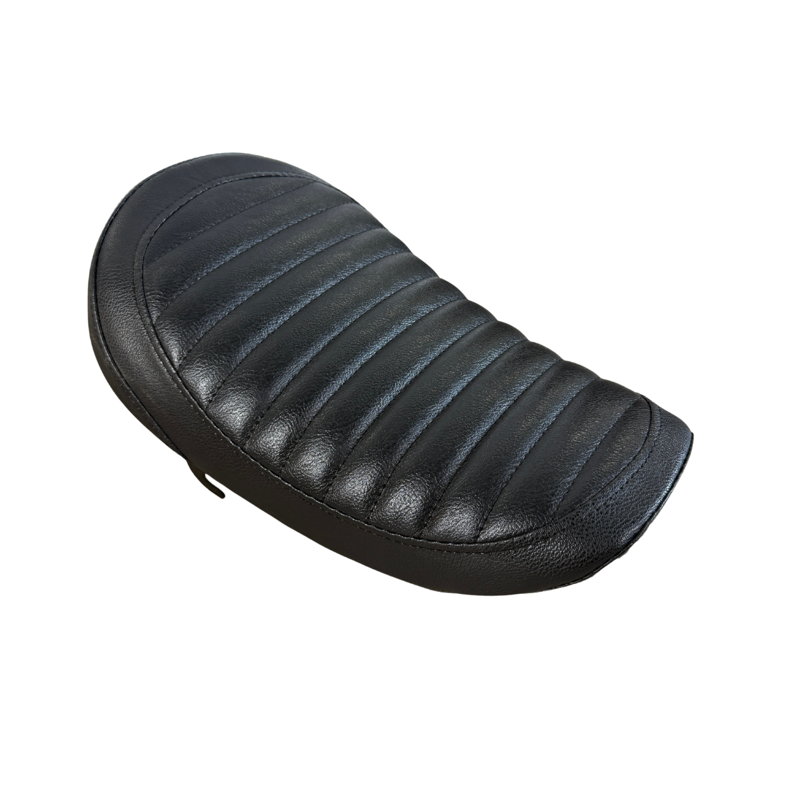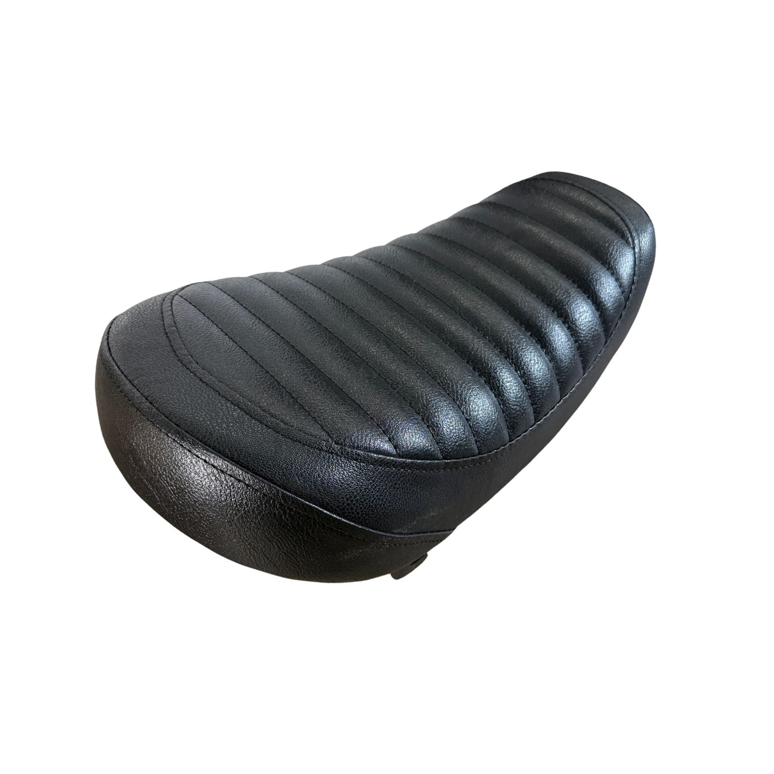 Selle basse en skaï noir avec coutures en lignes. La selle a une forme découpée (banane) et convient pour Honda Monkey Z50J et diverses répliques comme Singa, Chimp et Skymini.